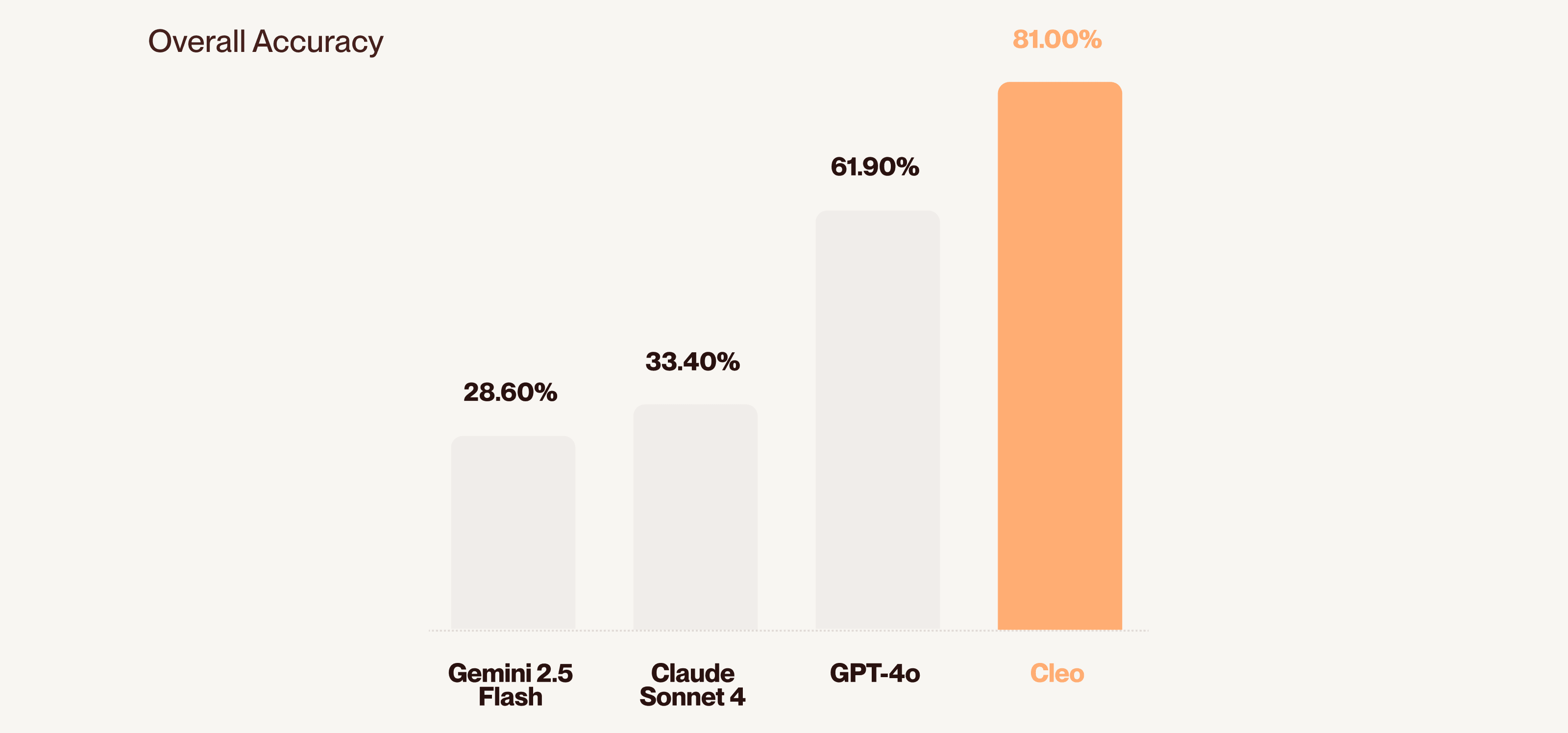 To measure how Cleo 3.0 stacks up, we put her head-to-head with leading LLMs from OpenAI, Anthropic, and Google.