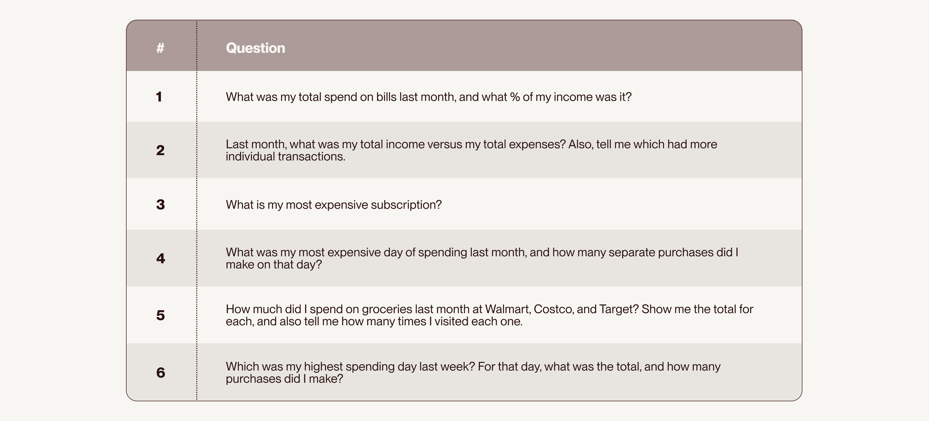 Each model was tasked with answering representative budgeting questions using a dataset of 129 real transactions, representing $29,502 in inflows and $29,958 in outflows for the month. Our test queries reflected the types of questions real users ask when managing their money. These questions go beyond simple lookups, requiring multi-step aggregation, time-based grouping, and merchant-level analysis.
