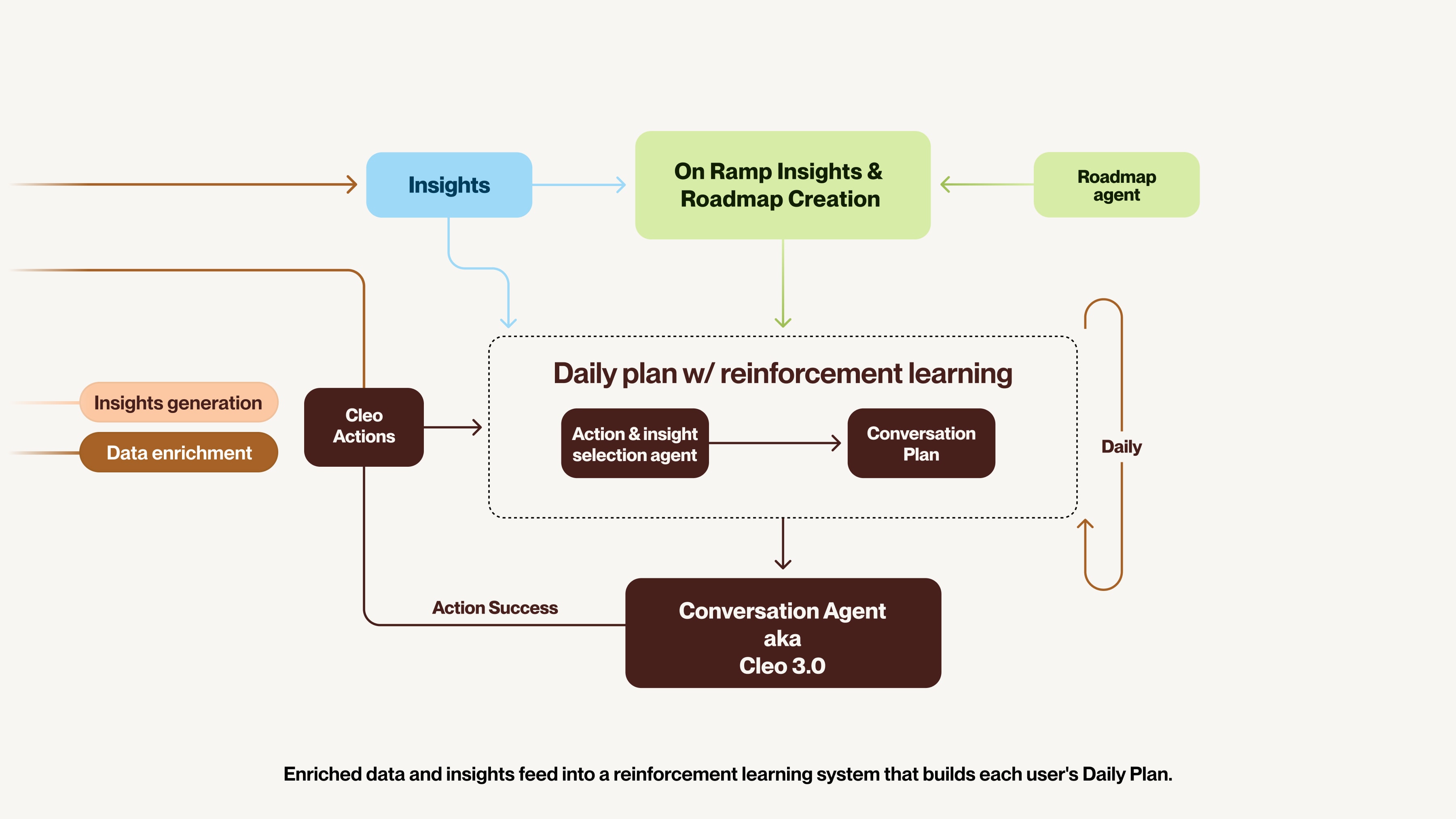 At the individual level, we’re also planning to teach Cleo to adapt to patterns in how a specific user engages with her. If someone consistently acts on a certain type of recommendation, and that decision helps them make progress against their Roadmap goal, Cleo should learn that that’s a useful lever for them and tailor her guidance accordingly.
