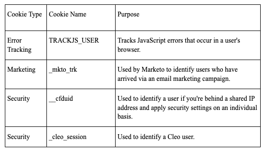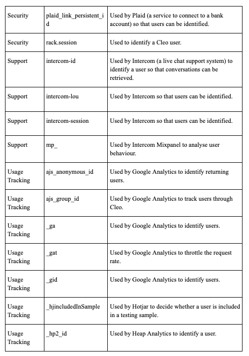 Cleo (‘we’ or ‘us’ throughout this document) is a data controller of the information that you provide to us or that we collect. ‘Data controller’ refers to a company that collects or stores personal information, and that accordingly takes on responsibilities regarding the security of that data.